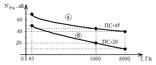 Шумовые колебания обладают свойством накопления в организме (кумулятивности). Вредность шума как фактора производственной среды приводит к необходимости ограничивать его уровень. Для профилактики и уменьшения вредного воздействия шума необходимо соблюдать гигиенические нормативы. В основу этих норм положены ограничения уровня звукового давления в пределах октавных полос всего спектра шума с учетом характера шума и особенностей трудовой деятельности. Совокупность октавных полос называется предельным спектром (рисунок 2.2), который показан для радиовещательной студии (б) и конструкторского бюро (а).