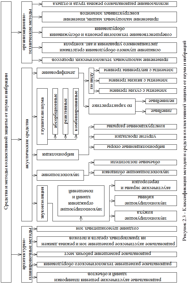 Например, «ПС-45» означает, что допустимый уровень звукового давления для помещения конструкторского бюро на частоте 1000 Гц не должен превышать с определенной точностью 45 дБ. Диапазон частот от 16 Гц до 20 кГц называется слышимым. Диапазон частот ниже 16 Гц – инфразвуковым, выше 20 кГц – ультразвуковым. И несмотря на то, что и инфразвуки, и ультразвуки не слышимы, их уровни тоже нормируют, т.к. оказывают неблагоприятное влияние на человека. Источниками шумов в городской среде является транспортные средства и промышленное оборудование, инфразвука – технологическое оборудование ударного действия, рельсовый транспорт и пневмоинструмент, ультразвука – ракетные двигатели и обдуваемые ветром водные поверхности и строительные площадки. Основными параметрами вибрации являются: частота и амплитуда колебания, вызывающие колебания тела человека при распространении вибрации по тканям организма, виброскорость и виброускорение. Бывает общая и местная. Общая подразделяется на транспортную, технологическую, транспортно-технологическую. Санитарные нормы устанавливают предельно допустимые величины вибрации. Для защиты от шума и вибраций применяются различные средства и методы личной и коллективной защиты. Классификация методов и средств коллективной защиты показаны на рисунке 2.3. Средствами индивидуальной защиты являются наушники, беруши и др. Наиболее эффективными являются средства, снижающие уровни шумов и вибраций в самом источнике, это не всегда достижимо. Но уж ни в коем случае нельзя отказываться от использования других средств защиты! Более подробно эта тема будет рассмотрена на занятиях со студентами специальности СС и СК.