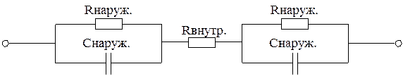 Рисунок 3.1 – Схема замещения тела человека По степени физиологического воздействия можно выделить следующие токи промышленной частоты воздействием более 1 секунды: 0,5 – 1,5 мА – пороговый ощутимый ток (т.е. наименьшее значение тока, которое человек начинает ощущать); 10 – 20 мА – пороговый не отпускающий ток (когда из-за судорожного сокращения рук человек самостоятельно не может освободится от токоведущих частей); 80 – 100 мА – пороговый фибрилляционный ток (расчетный поражающий ток), вызывающий неритмичные судорожные сокращения сердца, называемые фибрилляцией. Поражение электрическим током возможно лишь в состоянии полного покоя сердца человека. При продолжительности воздействия не более 10 минут в сутки в неаварийном режиме при нормальных метеорологических условиях предельно допустимые значения тока: частотой 50 Гц равно 0,3 мА, частотой 400 Гц – 0,4 мА, постоянного тока – 1 мА.