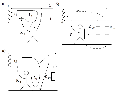 Рисунок 3.3 а) В случае двухполюсного прикосновения б) В случае однополюсного прикосновения при хорошем состоянии изоляции проводов (по нормам в) В случае однополюсного прикосновения к проводу 1 и замыкании другого провода 2 на землю Для двухпроводной сети с заземленным полюсом (рисунок 3.4) имеем: