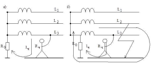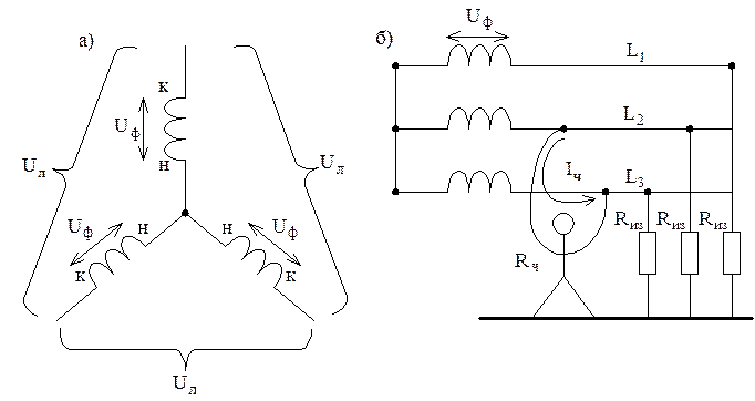 н – начало каждой фазы; к – конец каждой фазы. Соединение начал всех фаз в одну точку, называется нейтралью. Если нейтраль не имеет соединения (контакта с землей), то она называется изолированной. б) в случае двухполюсного касания человека к фазным проводам (
