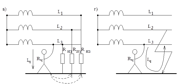 в) в случае однополюсного присоединения к фазному проводу при хорошем состоянии изоляции человек находится под защитой изоляции и через него протекает неопасный ток: