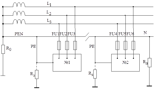 Рисунок 3.7 напряжения на корпусах оборудования при коротком замыкании фазы на корпус. Обычно №1, №2 – трехфазные электроустановки (потребители). Для уменьшения опасности поражения электрическим током можно подсоединить зануленный корпус к заземлителю ( Если используют нулевой защитный и нулевой рабочий проводник раздельно, то такая сеть называется пятипроводной (рисунок 3.8).
