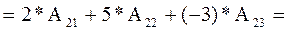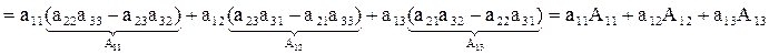 Это выражение называется разложением определителя по элементам первой строки. Значения A11, A12, A13, называются алгебраическими дополнениями элементов первой строки. Аналогично можно получить разложение определителя по элементам любой строки или столбца.