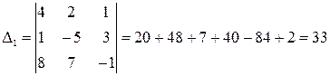 Определитель системы равен 33, то есть оказался отличным от 0. Следовательно, система имеет решение и притом единственное. Вычислим теперь побочные определители: