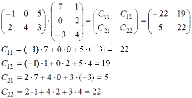 4) Умножение матриц друг на друга. Произведением матрицы А размерности Из определения следует, что нельзя перемножать матрицы произвольных размерностей. Условие перемножаемости: число столбцов первой матрицы должно быть равно числу строк второй матрицы. Правило «Строка на столбец» Рассмотрим его на примере: