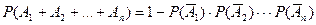 Вероятность суммы двух событий равна сумме вероятностей этих событий минус вероятность их произведения, т.е. Р (А + В) = Р (А) + Р (В) – Р (А × В). Частные случаи. 1. Для несовместных событий: Р (А + В) = Р(А) + Р(В). 2. Для независимых событий: Р (А + В) = Р (А) + Р (В) – Р (А) × Р (В). 3. Для событий, образующих полную группу Р ( 4. Для противоположных событий Р ( Вероятность осуществления хотя бы одного из событий удобнее вычислять по следующей формуле