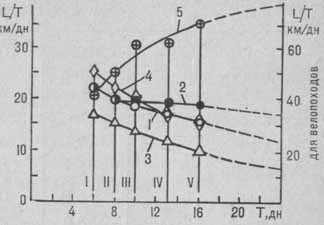 Продолжительность похода устанавливается разрядными требованиями (табл. 2) и понимается как минимальное время в днях, необходимое для прохождения маршрута подготовленной группой. Продолжительность похода может быть увеличена по сравнению с указанной в табл. 2 при увеличении протяженности маршрута, количества и сложности естественных препятствий, а также за счет дней на разведки и запасного времени на случай непогоды. При этом в методических указаниях к "Перечню" последнее, т. е. количество (дни отдыха, в том числе и активного, связанного с разведкой маршрута, выполнением общественно полезной работы и т. п.), оговаривается: "Количество дневок должно укладываться в пределы 20% от общей продолжительности похода". Относительно увеличения продолжительности похода при увеличении протяженности маршрута, количества и сложности естественных препятствий никаких указаний ни в "Перечне", ни в других регламентирующих документах не содержится. То есть продолжительность похода в сторону ее увеличения ни документами, ни в реальной туристской практике не регламентируется, но ограничивается лишь для походов высших категорий сложности пределами отпускного времени. Протяженность маршрута устанавливается разрядными требованиями и понимается как наименьшая допустимая длина зачетного маршрута данной категории сложности. При этом оговаривается, что даже минимальная протяженность маршрута, хотя и в исключительных случаях (при большой технической сложности), может быть уменьшена, но не более чем на 25% по сравнению с указанной в табл. 2. Приведенные в табл. 2 данные выражены графически на рис. 5 для пешеходного 1, лыжного 2, горного 3, водного 4 и велосипедного 5 туризма. Графики хотя и свидетельствуют о некотором нарушении монотонности функциональных зависимостей L=S(T), но в целом каких-либо серьезных претензий вызвать не могут, поскольку они малопоказательны. По-видимому, существенно больший интерес должны представлять те же данные, но переведенные в скорости движения и поставленные в зависимость от категории сложности походов и от их продолжительности одновременно (табл. 3 и рис. 6, обозначения те же, что и на рис. 5). Из рис. 6 (по сравнению с рис. 5) с большей очевидностью следует, что разрядными требованиями установлено монотонное уменьшение скорости передвижения с повышением категории сложности маршрута, т. е. с повышением уровня технической сложности естественных препятствий - более интенсивно для горного, пешеходного, водного, менее для лыжного туризма. С таким подходом нельзя не согласиться. Однако для велосипедного туризма зависимость носит прямо противоположный характер: с возрастанием категории сложности походов скорости передвижения монотонно возрастают.