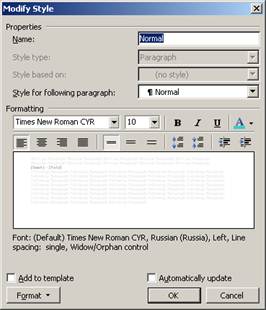 Для этого нужно последовательно выполнить следующие действия: а) [Format] – [Styles and Formatting…]; б) выбрать из списка “Pick formatting to apply” поле с названием редактируемого стиля; в) в поле с названием редактируемого стиля открыть меню, выбрать пункт “Modify Style”, во всплывающей панели “Modify Style” (рис. 5), активизировать кнопку Modify и сделать необходимые установки: