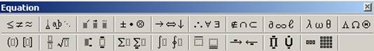 Для вставки формул: [Insert] – [Object…] – [Microsoft Equation 3.0]; Далее, используя средства создания специальных знаков на всплывающей панели инструментов “Equation” (Рис. 9), создать формулу.