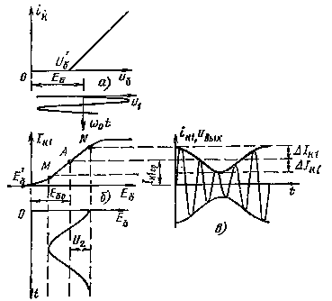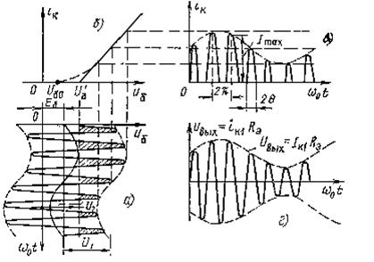 Мұнда u1 = U1 cos ω0t жоғарғы жиілікті кернеу; u2 = U2 cos Ωt - модулдеуші төменгі жиілікті кернеу. 7.3 а-в суретінде құралдың сипаттамасы бойынша i к=Ф(u б) проекция әдісімен i к –нің уақытқа байланыстылығы тұрғызылған. Коллекторлық тоқ бір-бірінен I max биіктігі және қиылуы бұрышымен өзгешеленетін импульс тізбектілігін көрсетеді. Егер осы жеке импульс тоғын, жоғарғы жиілік периодында ω0 жиілігінде орнатылған контурдағы кернеу, тек бірінші гармоникамен құрылады. ik1=Ik1cos ω0t: uвых=ik1Rэ=Ik1 Rэcos ω0t. Токтың импульсінің және енінің өзгеруі, уақыт өте келе Ω төменгі жиіліктегі, I к1 амплитудасының өзгерісіне әкеліп соғады. Сондықтан шығыс кернеу амплитуда бойынша модульденген болады
