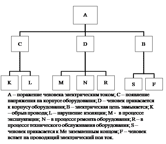 Построение дерева происшествий практически позволяет найти проходные и отсечные комбинации, а также рассчитать алгебру событий. Проходные комбинациями называют минимальное сочетание предпосылок, при одновременном присутствии которых возможно головное нежелательное событие. Например: KMS, KNS, KRS, KMF, KNF, KRF LMS, LNS, LRS, LMF, LMN, KRF. Отсечными комбинациями называют минимальное сочетание предпосылок, при одновременном отсутствии которых головное событие A невозможно. Например: KL, MNR, SF Если известна вероятность реализации каждой из предпосылок, то возможно рассчитать алгебру событий по формуле: