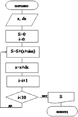 Программный код процедуры вычисления суммы. Private Sub btnOption_Click() Dim x, dx, S as single, i as byte x=Val(txtX.Text) dx=Val(txtdX.Text) S=0 i=0 Do While i< 10 S=S+x+sin(x) x=x+dx i=i+1 Loop txtS.Text=Str(S) End Sub b) Do …Loop While Блок-схема: Программный код: