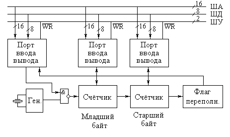 Таймеры предназначены для формирования временных интервалов, позволяя микропроцессорной системе работать в режиме реального времени. Таймеры представляют собой обычные цифровые счётчики, которые подсчитывают импульсы от высокостабильного генератора частоты. К системной шине микропроцессора таймеры подключаются при помощи параллельных портов. Генератор частоты, входящий в состав таймера, определяет минимальный интервал времени, который может определять таймер. Интервалы времени, задаваемые таймером, могут устанавливаться только из дискретного набора допустимых времён. Дискретность установки этих интервалов времени тоже определяется частотой задающего генератора. Разрядность цифрового счётчика, входящего в состав таймера, определяет максимальный интервал времени, который может определять таймер. Обычно используются 16-ти разрядные таймеры, поэтому, для подключения такого таймера к 8-ми разрядному процессору требуется два параллельных порта. Кроме того, таймером нужно управлять. Таймер нужно включать и выключать, часто требуется определять не возникало ли переполнение таймера (факт переполнения легко запомнить в дополнительном триггере, подключенном к выходу переноса счетчика таймера). Этот триггер называется флагом переполнения таймера. Триггер (флаг) включения и выключения таймера и флаг переполнения таймера подключают к системной шине микропроцессора через дополнительный порт ввода вывода. Структурная схема таймера, построенного по описанным выше принципам, приведена на рисунке 1.