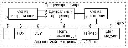 Изменяемый функциональный блок включает в себя модули памяти различного типа и объема, порты ввода/вывода, модули тактовых генераторов (Г), таймеры. В относительно простых МК модуль обработки прерываний входит в состав процессорного ядра. В более сложных МК он представляет собой отдельный модуль с развитыми возможностями. В состав изменяемого функционального блока могут входить и такие дополнительные модули как компараторы напряжения, аналого-цифровые преобразователи (АЦП) и другие. Каждый модуль проектируется для работы в составе МК с учетом протокола ВКМ. Данный подход позволяет создавать разнообразные по структуре МК в пределах одного семейства.