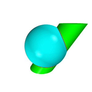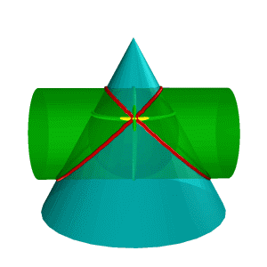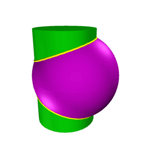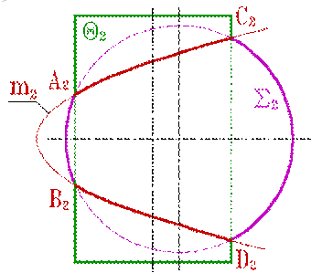 Плоскость симметрии определена осью симметрии цилиндра Q и центром сферы S (рис.8.39). Плоскости принадлежат и симметричные сами себе точки A, B, C и D линий пересечения. Проекция же линий на фронтальную плоскость имеет форму параболы m 2 и аналитически описывается формулой параболы.