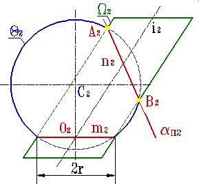 Плоскость σ, определяемая центром сферы С и осью i цилиндра, является плоскостью симметрии заданных поверхностей, и параллельна фронтальной плоскости проекций. Общая окружность радиуса r – это одна из плоских кривых второго порядка распавшейся линии пересечения. Остается построить вторую кривую, плоскость α которой должна быть в условиях данного примера перпендикулярна плоскости симметрии σ, а следовательно и П 2. Вторая линия пересечения (окружность) проецируется на П 2 в виде отрезка прямой n 2. Для ее построения следует воспользоваться точками А 2 и В 2, принадлежащими очеркам заданных поверхностей. Теорема 2. (о двойном касании). Если две поверхности второго порядка имеют касание в двух точках А и В, то линия их пересечения распадается на две плоские кривые второго порядка, плоскость которых проходит через отрезок АВ, соединяющий точки касания.