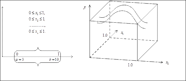 при решении задач на экстремум выбор алгоритма поиска оптимальных проектных параметров очень сильно зависит от целевой функции Как показывает опыт решения экспериментальных задач – желательно найти экстремум несколькими численными методами. В общем случае все численные методы поиска, даже при простых алгоритмах, весьма трудоёмки. Принято говорить о так называемом кубе поиска. Если отнормировать все проектные параметры:
