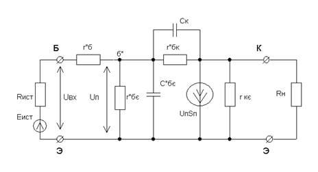 На П – образной физической эквивалентной схеме приняты следующие обозначения: r'б - объемное сопротивление базы (для НЧ - r'б ≈ 100 Ом, для ВЧ - r'б ≈50 Ом); r'бэ - сопротивление между базой и эмиттером (единицы и десятки Ом); r'бк - сопротивление между базой и коллектором (сотни кОм); r'кэ - сопротивление между коллектором и эмиттером; C'бэ - емкость между базой и эмиттером (сотни пикофарад); Cк=C'бк - емкость между базой и коллектором (десятки пікафарад);