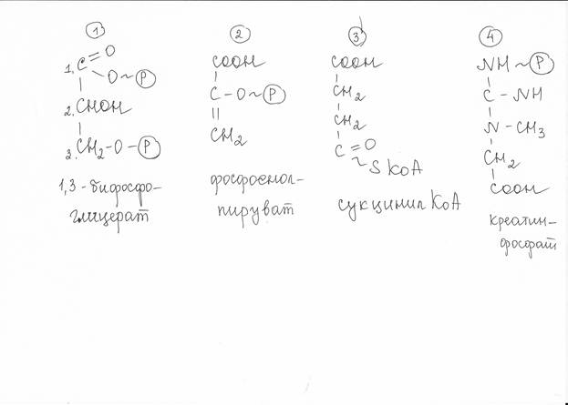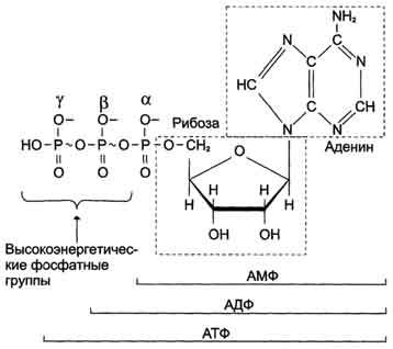 Соединения, расположенные ниже АТФ, составляют группу низкоэнергетических фосфатов. Центральное место среди соединений занимает АТФ. В молекуле АТФ две высокоэнергетические (макроэргические) связи β и γ, они обозначены на рисунке знаком ~ (тильда).