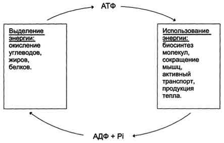 АТФ - главный, непосредственно используемый донор свободной энергии в биологических системах. В клетке молекула АТФ расходуется в течение одной минуты после её образования. У человека количество АТФ, равное массе тела, образуется и разрушается каждые 24 ч. Использование АТФ как источника энергии возможно только при условии непрерывного синтеза АТФ из АДФ за счёт энергии окисления органических соединений. Цикл АТФ-АДФ - основной механизм обмена энергии в биологических системах, а АТФ - универсальная "энергетическая валюта":