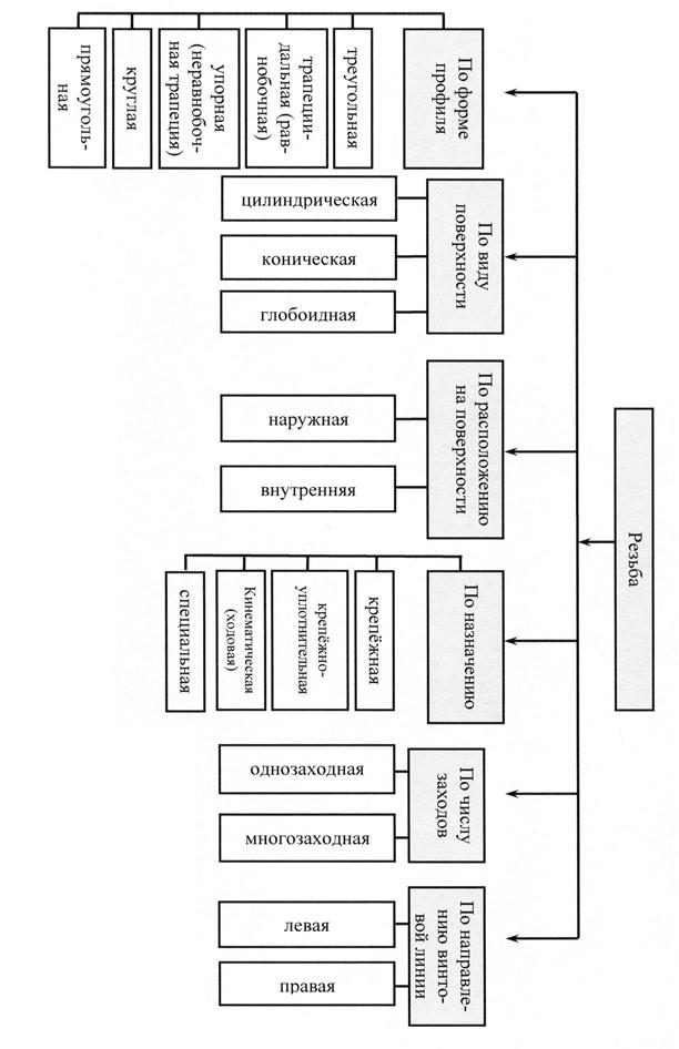 Резьба и резьбовые соединения широко распространены в технике. К их достоинствам относятся универсальность, надёжность, удобство сборки и разборки, простота изготовления. Классифицируем резьбы по наиболее характерным признакам. На рис. 1.22 показана схема классификации резьбы. Резьбы подразделяются в зависимости от формы профиля на резьбы треугольного, прямоугольного, трапецеидального, круглого и других профилей; в зависимости от вида поверхности, на которой нарезана резьба, они классифицируются на цилиндрическую резьбу, расположена на поверхности цилиндра вращения, коническую – на поверхности конуса вращения, глобоидную – на поверхности гиперболоида вращения; в зависимости от расположения резьбы на поверхности стержня или в отверстии они подразделяются на наружные и внутренние.