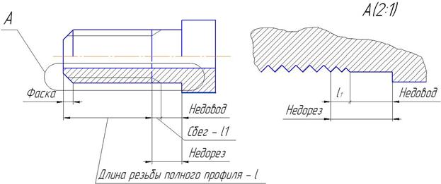Этот участок (l1 ) с неполноценной резьбой называется сбегом резьбы. Подобный сбег образуется и на конце глухого отверстия с резьбой, при применении метчика, у которого заборная часть имеет форму конуса (рис. 2.4, 2.7). Если резьбу выполняют до некоторой поверхности, не позволяющей доводить инструмент до упора к ней, то образуется недовод резьбы. Сбег и недовод образуют недорез резьбы (рис. 2.5). Если требуется изготовить резьбу на стержне полного профиля, то для вывода резьбонарезного инструмента делают проточку шириной b, диаметр d2, которой меньше внутреннего диаметра d1 резьбы (рис. 2.6).