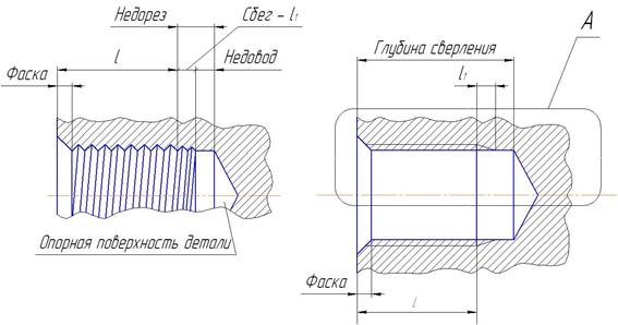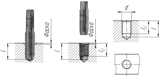 Способ изготовления глухого резьбового отверстия метчиком и его условное изображение показано на рис. 2.10. Следует знать, что под завернутой шпилькой или винтом остается незаполненная часть гнезда. Эта нижняя часть гнезда имеет запас полной резьбы, резьбу неполного профиля – сбег из-за нижней заборной части метчика и не нарезанную часть. Фаска в гладком отверстии выполняется до нарезания резьбы метчиком. Номинальный диаметр резьбы d равен диаметру метчика, l – полная глубина отверстия, l0 – длина полного профиля резьбы.