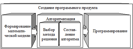 Любой программный продукт (программное средство) создаётся человеком. В зависимости от назначения и сложности программного продукта его разработка требует разного уровня профессионализма. Системное ПО, как правило, создаётся профессионалами высшей квалификации – системными программистами. Прикладные программы в принципе могут создаваться специалистами любой области знаний, владеющими основами программирования на языках высокого уровня. Однако сложные прикладные программы по заказу разрабатываются профессионалами – прикладными программистами. Независимо от степи сложности задачи и квалификации программиста создание программного продукта выполняется с использованием стандартных методик. Создание программного продукта (предмашинная подготовка задачи) – этап последовательного преобразования задачи в программный продукт. Программный продукт есть оформление задачи в виде доступном ЭВМ. Создание программных продуктов базируется на принципах математизации, алгоритмизации и программирования. В общем виде математизация подразумевает создание математической модели задачи, алгоритмизация позволяет выбрать метод её решения и оформить его в подетальном виде, понятном человеку (алгоритмом), программирование позволяет преобразовать полученный алгоритм в форму доступную ЭВМ. Степень детализации предмашинной подготовки может быть различной. Укрупнённая схема создания программного продукта имеет вид (рис. 2.2).