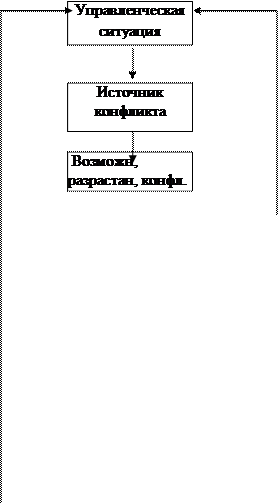 Рисунок 1- Модель конфликта как процесса. Часто внутри организации начинают конфликтовать разные функциональные группы. Например, отдел технологов за то кто должен выдавать задание станционникам. Этот конфликт при его решении снимает конфронтацию и способствует урегулированию вопросов, которые раньше не были решены. Это пример функционального конфликта. На рисунке 1 видно, что конфликт происходит, когда для этого есть причина. К ним следует отнести: · Распределение ресурсов в основном ограниченных 1) Делится премия, за какой либо проект; 2) Распределение нагрузки между преподавателями; 3) Работа на ИПО, где больше платят. · Взаимосвязь задач 1) Когда геологи не справились с задачей и на них выступили технологи; В свою очередь геологи сказали, что виноват отдел механизации инженерных работ, а последний винит снабжение. · Различия в целях 1) Производственные отделы хотят иметь больше и разнообразную номенклатуру товаров на складе, чтобы легче было работать, и было с чего выбрать, а бухгалтерия желает другого – поменьше и малый ассортимент, да ещё и подешевле. · Различия в предоставлении и ценностях 1) Факультет думает о том, чтобы дисциплины читали лучшие специалисты, а кафедры думают о загрузки своих преподавателей часами. И поэтому часто дисциплины передают не профилирующие кафедры. · Различия в манере поведения и жизненном опыте. 1) В Венгрии директор магазина запрещает продавцам садиться. 2) Умудренный опытом работник желает все делать по старинке, а молодежь требует новых решений · Неудовлетворительные коммуникации 1) Плохая передача информации может стать причиной конфликта Следующий важный блок на рисунке 1 функциональные и дисфункциональные последствия конфликта. 1) Функциональные последствия конфликта: - конфликт решается путем приемлемым для всех сторон; - другое функциональное последствие это после конфликта стороны будут больше расположены к сотрудничеству; - уменьшает возможность группового мышления и синдрома покорности, когда подчиненные не высказывают идей, которые противоречат идеям их руководителей; - улучшения процесса принятия решений; - через конфликты члены группы могут проработать новые проблемы, которые ранее не затрагивались; 2) Дисфункциональная последовательность конфликта возникают тогда, когда не удалось найти решения устраивавшие все стороны. В результате возникают: · неудовлетворенность, плохое состояние духа, снижение производительности, уход с работы; · меньшая степень сотрудничества в будущем; · рост конфронтации между группами; · представление о другой личности, как о враге; · уменьшение контактов; · увеличение враждебности; · придания большого значения «победе» в конфликте, чем решению реальной проблемы.