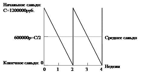 Модель Баумола. Модель Баумола применяется при равномерном поступлении и расходовании денежных средств на предприятии. Модель Baumol–Allais–Tobin (BAT) является классическим средством анализа проблем управления деньгами. Покажем, как эта модель может быть использована для действительного установления планового сальдо денежных средств. Это простая модель и очень полезная для иллюстрации особенностей управления деньгами и, более широко, управления текущими активами. Пример 8.1. Чтобы развернуть модель ВАТ, предположим, что предприятие начинает нулевую неделю с сальдо денежных средств С = 1,2руб. миллиона. Каждую неделю оттоки превышают притоки средств на 600000руб., В результате, в конце 2 недели сальдо денежных средств станет нулевым. Среднее денежное сальдо за 2–х недельный период составляет сумму начального (1,2 руб. миллиона) и конечного сальдо (0 руб.), деленное на 2, или 1,2 руб. миллиона + 0)/2 = 600000руб. В конце 2 недели GoldenSocks пополняет свои средства депонированием очередных 1,2 руб. миллиона. Как уже сказано, стратегия управления наличностью предприятия очень проста и сводится к депонированию 1,2 руб. миллиона каждые две недели. Эта политика показана на рис. 8.1. Отметим, как денежное сальдо снижается на 600000 руб. в неделю. Хотя мы добавляем на счет по 1,2 руб. миллиона, оно падает до нуля каждые две недели. Результатом является модель «зуб пилы», отображенная на рис. 8.1.