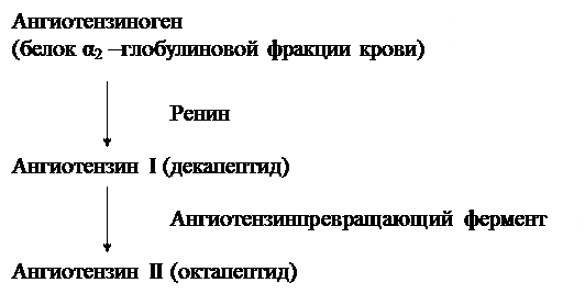 При понижении артериального давления в приносящих артериолах почек если уменьшения содержания натрия в дистальных канальцах в гранулярных клетках юкстагломерулярного аппарата почек синтезируется и секретируется в кровь протеолитических фермент-ренин. Дальнейшая активация системы показана на рис. 29.2.