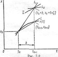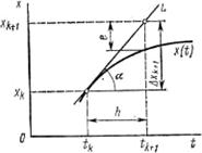 x״ + ax′ = t2. Оно эквивалентно системе двух уравнений первого порядка: x′ = y; y′ = t2– ay. Как известно, общим решением уравнения (3-1) называется решение, зависящее от произвольной постоянной интегрирования и содержащее все частные решения исходного уравнения. Очевидно, что подобное решение получить численными методами нельзя. Они используются для нахождения частного решения уравнения, удовлетворяющего заданным начальным условиям: t = t0, x(t0) = x0. (3-2) Заменим в уравнении (3-1) производную х' отношением конечных малых приращений Δх и Δt: Δx/Δt=f{t, x), откуда Δ x = f{t, х)Δt (3-3) Зная начальные условия интегрирования согласно (7-3), запишем приращение искомой функции на первом шаге в следующем виде: Δx1 = f (t0 , x0) Δt, т.е. x1 = x0 + Δx1. Аналогично получим приращения искомой функции на втором шаге, зная значение правой части уравнения (3-1) при t=t1 и x = x1 Отмечая нижним индексом «k-» значения переменных на k-м шаге интегрирования, представим (3-3) как Δxk+1 = f (tk, xk) Δt (3-4) или Δxk + 1 = xk + f (tk, x k) h (3-5) где Δ t = h -- шаг интегрирования. Рассмотрим геометрический смысл выражения (3-4), зная, что для производной—это тангенс угла наклона касательной L к интегральной кривой х (t) в заданной точке (t k, x k) по отношению к оси абсцисс (рис. 3-1). Метод численного решения дифференциального уравнения сводится к замене реальной интегральной кривой конечным числом прямолинейных отрезков. При этом возникают ошибки двух видов: ошибка ограничения (локальная ошибка интегрирования, показана на рис. 3-1 отрезком e) и накапливаемая (интегральная) за время интегрирования ошибка. Наличие этих ошибок может приводить в некоторых случаях к совершенно неприемлемым результатам. Для их уменьшения есть только один путь—уменьшение шага интегрирования, что при неизменном полном времени