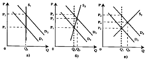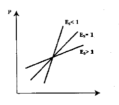 На рисунке ниже показаны три линии предложения с разной эластичностью. Эластичность предложения товара зависит от многих факторов: от структуры издержек на разных предприятиях, степени загрузки производственных мощностей, наличия свободной рабочей силы, быстроты перелива ка питала из одной отрасли в другую и т. д.