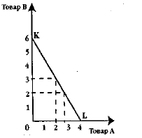 Чем же объясняется такая конфигурация? Допустим, потребителю нравится минеральная вода, но у него совершенно одинаковые предпочтения по отношению к газированной и негазированной воде. В так ом случае он готов пожертвовать 1 единицей газированной воды, увеличив на 1 единицу потребление негазированной воды. Наклон кривой безразличия, имеющей линейный вид, в таком случае в любой ее точке везде будет равен - 1. В случае же товаров - совершенных комплементов (рис. б) потребитель сталкивается с ситуацией, когда товары могут потребляться лишь в строго постоянной пропорции. Например, электронные часы и батарейка к ним. Электронные часы без батарейки не могут использоваться. Увеличение электронных часов до 2 единиц при 1 батарейке никак не отражается на увеличении благосостояния потребителя. То же самое можно сказать и про увеличение батареек до 2 единиц при 1 единице часов. Запас батареек, как может показаться некоторым читателям, никак не увеличивает благосостояния потребителя: ведь вставить в часы можно лишь одну батарейку. Кри вая безразличия в таком случае будет иметь I-образный вид. Ранее мы условились, что потребитель имеет фиксированный денежный доход. Пусть он тратит 6 руб. в день, причем товар А стоит 1,5 руб., а товар В - 1 руб. Если потратить все деньги на товар А, то можно купить 4 ед., если все деньги потратить на товар В, то можно купить 6 ед. Ясно, что потребитель может израсходовать свои деньги на любую из возможных комбинаций товаров А и В в пределах 6 руб. На рис. ниже прямая линия KL - это линия возможностей потребления для да нного потребителя, или бюджетная линия (бюджетное ограничение). Уравнение бюджетной линии можно вывести из уравнения дохода: I = Px∙Qx + Py∙Qy