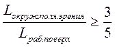 Колебания светового потока недопустимы, т.к. они вызывают частую адаптацию глаз и приводят к их утомлению. У газоразрядных ламп из-за низкой инерции вслед за изменениями переменного тока происходят колебания светового потока. При включении ламп по схеме «три лампы на разные фазы», коэффициент пульсации уменьшается на 3-5%; - равномерное распределение яркости в поле зрения, для комбинированного освещения рекомендуется - отсутствие резких теней (особенно движущихся), тени исчезают при наличии отраженного освещения, рекомендуется направление светового потока на рабочую поверхность под углом 60°; - отсутствие прямой блескости: блескостью называется свойство ярких светящихся поверхностей (нить накала, трубка) нарушать зрительные функции глаза – ослеплять их. Для защиты глаз лампы помещают в арматуру с защитным углом α≥10÷30°. Нормируется показатель ослепленности р≤20-80 единиц (расчет в СНиП II-4-79) - отсутствие отраженной блескости: нормируется максимально допустимая яркость рабочей поверхности Lдоп≤500÷2500кд/м2 при площади отражения S = 0,2÷0,01м2. Основное требование к освещению – освещенность рабочей поверхности должна быть не менее допустимой при высоком качестве освещения. Установлен нормы (СНиП II-4-79) в зависимости от размеров объекта различения, контраста объекта с фоном и коэффициента отражения рабочей поверхности. Все зрительные работы разделены на 8 разрядов в зависимости от их точности (т.е. наименьшего размера объекта различения глазом). Каждый разряд делится на 4 подразряда в зависимости от сочетания «контраст-фон». Фон – поверхность, на которой рассматривается объект. Он характеризуется коэффициентом отражения ρ = Фотр/Флад. Черная ткань ρ = 0,02, белая бумага ρ = 0,8. для глаза всегда лучше, если фон светлый. Принято ρ>0,4 – фон светлый ρ = 0,2÷0,4 – средний ρ < 0,2 – темный Контрастом называется отношение: