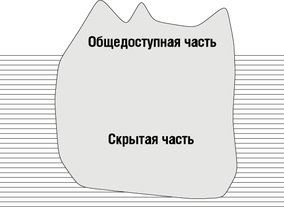Правило Скрытия Информации можно сформулировать следующим образом: Разработчик каждого модуля должен выбрать некоторое подмножество свойств модуля в качестве официальной информации о модуле, доступной авторам клиентских модулей. Применение этого правила означает, что каждый модуль известен всем остальным (то есть разработчикам других модулей) через некоторое официальное описание, или так называемые общедоступные (public) свойства. Конечно, таким описанием может быть весь текст модуля (текст программы, текст проекта): он и обеспечивает правильное представление о модуле, поскольку это и есть модуль! Но правило Скрытия Информации устанавливает, что в общем случае это не обязательно: описание должно включать лишь некоторые из свойств модуля. Остальные свойства должны оставаться не общедоступными, или закрытыми (секретные) (secret). Вместо терминов - общедоступные и закрытые свойства - используются также термины: экспортируемые и частные (скрытые) (private) свойства. Общедоступные свойства модуля известны также как интерфейс (interface) модуля (не следует путать с пользовательским интерфейсом системы программирования). В основе правила Скрытия Информации лежит критерий непрерывности. Предположим, что в некотором модуле происходят изменения, касающиеся лишь его скрытых элементов и не затрагивающие общедоступных свойств; тогда на другие обращающиеся к нему модули, называемые его клиентами, эти изменения не подействуют. Чем меньше общедоступная часть, тем больше шансов на то, что изменения в модуле будут содержаться в его скрытой части. Можно изобразить модуль, поддерживающий правило Скрытия Информации, в виде айсберга; лишь его верхушка - интерфейс - видна клиентам.