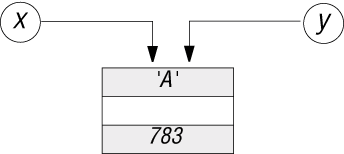 Рис. 8.23. Разделение как результат присоединения В результате x и y становятся тесно связанными до тех пор, пока x или y не будет присвоено новое значение. В частности любая операция вида x.f, где f некоторый компонент соответствующего класса, приведет к тому же результату, что и y.f, поскольку воздействует на тот же объект. Присоединение x к тому же объекту, что и y, известно как назначение динамического псевдонима (dynamic aliasing). Псевдоним является динамическим, поскольку существует только во время выполнения. Статические псевдонимы закрепляют два имени за одним и тем же программным элементом в исходном тексте, и они всегда обозначают одно и то же значение вне зависимости от событий, происходящих во время выполнения. Этот прием включен в некоторые языки программирования. В Fortran директива EQUIVALENCE означает, что две переменные разделяют содержимое одной и той же области памяти. Директива препроцессора C #define x y определяет, что любое упоминание x в тексте программы эквивалентно y. Наличие динамических псевдонимов оказывает более серьезное влияние на операции присваивания с участием сущностей ссылочного типа, нежели с участием сущностей развернутого типа. В случае x и y развернутого типа INTEGER присваивание x:= y просто устанавливает для x значение y и никакого связывания x и y не происходит. После подобного присваивания с участием ссылочных типов x и y становятся псевдонимами одного объекта.