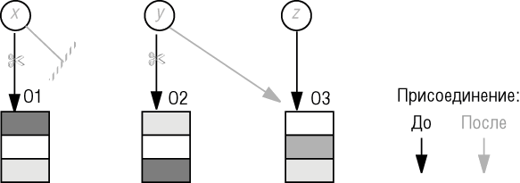 В динамическом режиме объекты могут стать ненужными в непредсказуемые моменты периода выполнения; раз так, то некоторый механизм (определяемый позже в этом обсуждении) может освобождать занятую ими память. Причина - присутствие в этом режиме выполнения операции отсоединения (detachment), обратной к операции присоединения. В предыдущей лекции изучалось, как сущности присоединяются к объектам, но не рассматривались детали отсоединения. Пора это исправить. Отсоединение распространяется только на объекты x ссылочного типа. Если x развернутого типа - значением x является объект O, то нет способа отсоединить x от O. Заметьте, однако, если x развернутый атрибут некоторого класса, O представляет подобъект некоторого большого объекта BO. Тогда BO, а вместе с ним и O, может стать недостижимым по одной из причин, изучаемых ниже. Посему в оставшейся части этой лекции можно ограничиться рассмотрением сущностей ссылочного типа. Рис. 9.4. Отсоединение Основные причины отсоединения следующие. Предположим, x и y сущности ссылочного типа вначале присоединены к объектам O1 и O2. Рисунок иллюстрирует случаи D1 и D2. [x]. (D1) Присваивание вида x:= Void, или x:= v где v типа void, отсоединяет x от O1. [x]. (D2) Присваивание вида y:= z, где z не присоединен к объекту O2, отсоединяет y от O2. [x]. (D3) Завершение подпрограммы отсоединяет формальные аргументы от присоединенных к ним объектов. [x]. (D4) Инструкция создания create x, присоединяет x к вновь созданному объекту и, следовательно, отсоединяет x, если он ранее был присоединен к объекту O1. Случай D3 соответствует ранее данному правилу: инициализация формального аргумента a подпрограммы r во время вызова t.r(..., b,...), где позиция b в вызове соответствует позиции a в объявлении r, в точности соответствует семантике присваивания a:= b.