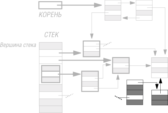 Рис. 9.8. Достижимость в ОО-модели Работа любой системы начинается с создания объекта, называемого корневым объектом системы, или просто корнем (когда нет путаницы с корневым классом, задаваемым статически). Корень в этом случае является одним из оригиналов. Другое множество оригиналов возникает из-за возможного присутствия локальных переменных в подпрограмме. Рассмотрим подпрограмму вида