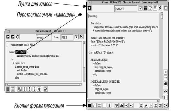 Рис. 15.12. Pick and throw (Выбрать и перетащить) Обратите внимание на нижнюю строку с кнопками форматирования. Нажатие каждой из них позволяет получить разнообразную информацию о классе ARRAY, например краткую форму класса. Как показано на рисунке, пользователь, работая в окне Feature Tool, выбрал щелчком правой кнопки класс INTEGER. Он передвигает его в направлении "лунки" класса в окне Class Tool, настроенного сейчас на ARRAY. Перетаскивание завершается щелчком правой кнопки на "лунке" класса, форма которой соответствует форме камешка. Тем самым Class Tool будет перенастроен на работу с выбранным классом INTEGER. Иногда удобнее, чтобы "лунка" была одновременно и кнопкой, что позволяет не только "загонять" в нее объект, но независимо от этого щелкать по ней левой кнопкой. Таковой является наша "лунка" класса, точка внутри которой указывает на присутствие в ней объекта (сначала ARRAY, а затем INTEGER). Щелчок по ней левой кнопкой перенастроит инструмент на работу с текущим объектом, что полезно, когда дисплей отражает другую информацию. Такая лунка с кнопкой реализуется специальным классом BUTTONHOLE. Нетрудно догадаться, что класс BUTTONHOLE возникает в результате наследования от классов BUTTON и HOLE. Новый класс сочетает в себе компоненты и свойства обоих родителей, реагирует как кнопка, и допускает операции как над лункой.