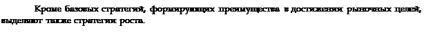 Одной из наиболее распространенных стратегий, соответствующих наступательному духу бизнеса, является стратегия роста фирмы, ориентированная на расширение операций, рост ее доли на рынке, увеличение сбыта, рост прибыли и т.д. Выделяются два направления роста фирмы: интенсивный и интеграционный. Интенсивный рост осуществляется преимущественно за счет использования приемов агрессивного маркетинга: захвата новых позиций на рынке с помощью новых и модернизированных товаров, совершенствования методов сбыта / торговли и сервиса, усиленного воздействия на контактные аудитории, активной рекламы и т.д. Интеграционный рост проявляется в установлении мягкого или жесткого контроля над партнерами, клиентами и конкурентами, в целенаправленном воздействии на их поведение. В соответствии с этим различаются три типа интеграции: • регрессивная - осуществление контроля за поставщиками; • прогрессивная - контроль за системой распределения (дистрибьюции); • горизонтальная - контроль за конкурентами. Известны различные методы обеспечения интеграционного роста. Одним из них является система соглашений, учитывающих как интересы каждого из участников, так и общие интересы, когда все поступаются частью своего суверенитета в расчете на выгоды, получаемые от консолидации маркетинговых действий. Более высоким уровнем интеграционной согласованности является создание холдинговой системы, где одна компания, обладающая контрольным пакетом акций, контролирует и направляет остальные, исходя из общих интересов. Еще более жесткой формой интеграции является скупка акций других участников, что ведет к поглощению или слиянию компаний и позволяет диктовать им свою волю в собственных интересах. Наиболее мягкой формой интеграции является система личностных контактов и «джентельменских соглашений». Иногда фирма открывает филиалы или образует дочерние компании, специализирующиеся на поставках или на торгово-посреднической деятельности. Кроме базовых стратегий, стратегий роста выделяют конкурентные маркетинговые стратегии. Конкурентные стратегии «Лидера» «Бросающего вызов» «Следующего за лидером» «Специалиста»