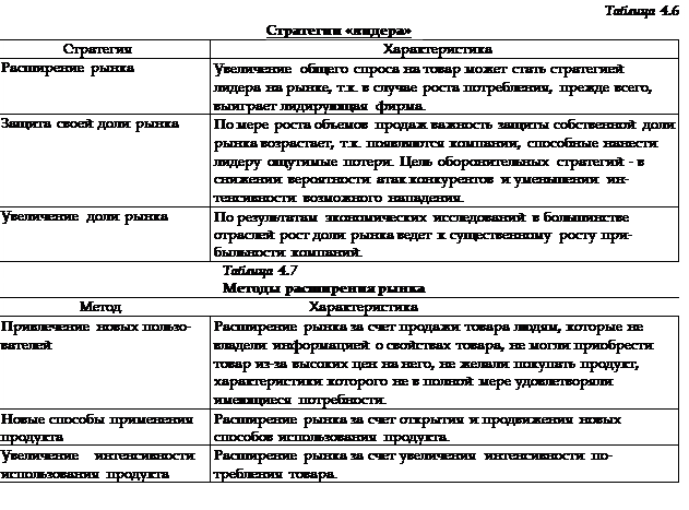 Стратегия «следующего за лидером». Основа стратегии «следующего за лидером» -адаптивное поведение, согласованное с действиями конкурентов, и стремление доминировать по издержкам. Подобная стратегия предполагает «мирное сосуществование» и осознанный раздел рынка и выбирается тогда, когда возможности дифференциации малы, а ценовая борьба ведет в итоге к потерям для всех конкурентов. Многие компании предпочитают следовать за лидерами рынка, однако последние весьма ревниво относятся к их попыткам переманить клиентов. Если последователь предлагает низкие цены, услуги высокого качества или улучшенный продукт, лидер имеет возможность мгновенно предпринять адекватные шаги. Практически лидер превосходит последователей во всех видах конкурентной борьбы. Поскольку схватка, что наиболее вероятно, приведет к ослаблению обеих компаний к радости конкурентов, последователь должен семь раз отмерить, прежде чем броситься в атаку. В случае если последователь не в силах нанести упреждающий удар в виде нового продукта или резкого расширения системы распределения, ему следует держаться за лидером, не пытаясь атаковать его. Следование за лидером не означает пассивное копирование. Выделяют четыре частных стратегии последователей.