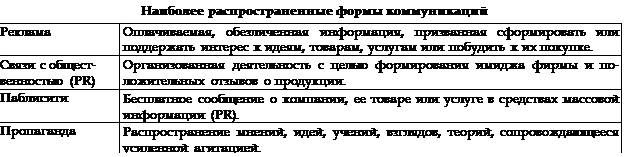 8.1. Цели маркетинговых коммуникаций Современный маркетинг требует гораздо большего, чем просто создать хороший товар, назначить на него привлекательную цену и обеспечить его доступность для целевых покупателей. Фирмы должны еще заниматься активным продвижением товара, т.е. налаживать коммуникации со своими заказчиками. При этом в содержании коммуникаций не должно быть ничего случайного. Маркетинг коммуникаций представляет собой маркетинговую деятельность, обеспечивающую создание благоприятного образа товара и самой фирмы в представлении потребителей. Продвижение (англ. - promotion) - это любая форма сообщений, используемых фирмой для информации, убеждения или напоминания потребителям о своих товарах и их достоинствах. Коммуникации (в маркетинге) - методы и формы подачи информации и воздействия на определенную (целевую) аудиторию. Целевая аудитория - это совокупность потребителей, принимающих покупатель- Продвижение товаров должно возбуждать у потребителей желание сделать первую покупку и совершать все последующие. Наиболее распространенные в настоящее время формы коммуникаций представлены в таб. 8.1.