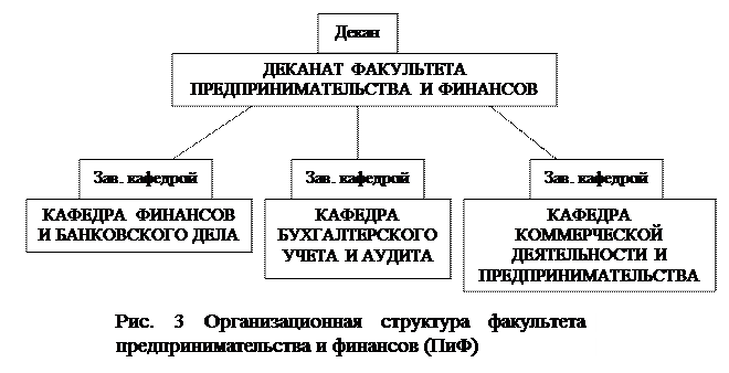 В состав факультета предпринимательства и финансов (ПиФ) входит три кафедры (ФиБД, БУиА, КДиП) и деканат, который является органом управления факультетом (рис. 3). В структуру управления факультетом входят: Ученый совет, Учебно-методический совет, Деканат, Общественные организации (рис. 4). В структуру управления деканатом факультета ПиФ: Декан, Зам. декана по учебной работе (по спец ФиК и по спец БУ,АиА, К(тд)), Зам. декана по работе со студентами во внеучебное время, специалисты (по очной форме и по очно-заочной, заочной формах), лаборанты (рис. 5).