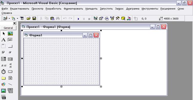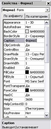 Вікно форми (рис.2.2), яке часто називається просто «форма», є головним елементом додатка. Форма являє собою контейнер для елементів керування. Крапки сітки на формі допомагають розміщенню елементів при роботі додатка. Клацнувши два рази по заголовку форми можна змінювати розмір вікна від стандартного до екранного розміру вікна проекту та навпаки. Можна також змінювати розмір вікна форми за допомогою трьох маркерів рамки вікна форми, перетягуючи потрібний маркер в сторону збільшення або зменшення рамки. Це важливо тому, що зміст вікна форми не підганяється автоматично до його змінених розмірів. Це може привести до того, що елемент управління після зміни розміру вікна буде знаходитись поза видимою областю і ви можете забути про нього. Не включиться також і смуга прокрутки. Також змінити висоту та ширину форми в режимі проектування можна за допомогою властивостей Height та Width, які можна відшукати у вікні Свойства. Якщо розміри форми стають більші ніж розміри вікна з формою в режимі проектування, з'являються смуги прокрутки. Змінити розмір форми можна також і в режимі виконання програми, що не впливає на значення властивостей Height та Width. При запуску форма, що відкривається на екрані, не містить елементів керування. Після клацання на піктограмі необхідного елемента керування курсор миші приймає форму хрестика. Тепер потрібно вказати у формі початковий кут елемента керування, натиснути ліву кнопку миші і, не відпускаючи її, встановити розмір елемента. Після досягнення потрібного розміру кнопка відпускається й у формі з'являється обраний елемент керування. Кожна форма зберігається в проекті у вигляді окремого файлу. Цей файл утримує опис робочого середовища і код, який відноситься до елементів керування і форми. Форми зберігаються як звичайні текстові файли. Переглянемо нижче деякі властивості (таблиця 1). Для зміни заголовку форми необхідно відшукати у списку властивостей Caption, виділити її подвійним клацанням мишки і ввести текст заголовку. Змінити колір фону форми можна подвійним клацанням мишки на властивості ВасkСо1оr (відкриється для вибору палітра кольорів). Властивості Left, Тор визначають положення форми на екрані при запуску програми на виконання. Це координати лівого верхнього кута форми у твіпах (1/1440 логічного дюйма (залежить від монітора)). В режимі виконання можна переміщувати форму, як звичайне вікно форми, що не впливає на властивості Left, Тор.