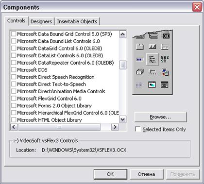 Рисунок 2.3. Панель елементів управління «ТооІЬох General» Зазвичай панель розташована ліворуч від форми. Якщо на екрані панель відсутня, натисніть кнопку Инструменты (Tools) на панелі інструментів Стандартная. Для вибору елемента керування потрібно клацнути на ньому і потім за допомогою миші встановити у формі його розмір і позицію. Після подвійного клацання на піктограмі елемента в центрі форми з'являється відповідний елемент стандартного розміру. Форму також можна настроювати зменшуючи або збільшуючи кількість елементів на ній. Щоб розмістити новий елемент управління на панелі, необхідно вибрати команду Компоненты (Components) у меню Разработать (Project). З'явиться діалогове вікно Components (Рис.2.4). Потрібно виділити прапорцем необхідний елемент і натиснути кнопку Применить. Обраний елемент з’явиться на панелі інструментів.