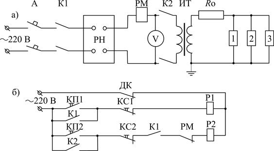 Рис.1.1. Общая схема испытательной установки переменного напряжения промышленной частоты а) и её схема управления б). При включении рубильника А и замкнутом дверном контакте ДК подготовлена цепь для подачи напряжения на регулятор напряжения РН. При нажатии кнопки пуск пускателя 1 цепь управления замыкается и ток, протекающий по обмотке Р1, притягивает якорь пускателя, а контакты К1 замыкаются, блокируя кнопку пуск КП1 и подготавливая цепь для подачи напряжения на испытательный трансформатор. После подачи напряжения на РН по показаниям вольтметра следует убедиться, что напряжение на выходе регулятора не превышает 30% от максимального первичного напряжения ИТ, требуемого при испытаниях. Нажатие кнопки пуск пускателя 2 приводит к подаче напряжения на ИТ и, соответственно, высокого напряжения на объект испытания. Запрещается включение ИТ при первичном напряжении более 30% от максимального первичного напряжения ИТ. Дальнейший подъем напряжения должен быть быстрым и плавным, допускающим снятие показаний измерительного прибора при напряжениях более ¾ от максимального. После достижения требуемого значения напряжение должно плавно быть снижено до нуля или до значения, меньшего 1/3 испытательного. Только после этого может быть произведено отключение высокого напряжения. Ограничивающее сопротивление R о (защитный резистор) предназначено для ограничения тока короткого замыкания и защиты испытательного трансформатора при крутых срезах напряжения после пробоя испытуемой изоляции. При проведении испытаний «под дождём» из-за сравнительно большого поверхностного тока утечки изоляторов падение напряжения на защитном резисторе становится большим и сравнимым с падение напряжения на объекте испытаний. По этой причине этот тип испытаний в ряде случаев допускается проводить с отключенным ограничивающим сопротивлением.