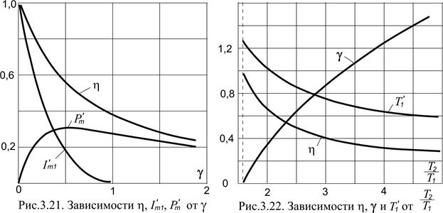 Изменение параметров уравнений (3.23 ¸ 3.32) показано на рис.3.21 в зависимости от показателя характера разряда ГИТ (g) и от отношения времени длительности импульса (Т 2, рис.3.3) к времени подъёма импульса (Т 1) на рис. 3.22. Приведённое время подъёма тока импульса: Коэффициент использования по току (h), амплитуда после первого прохождения через нуль (