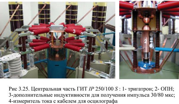 При конструировании ГИТ стремятся уменьшить собственные индуктивности схемы. Для этого накопительные конденсаторы соединяют в батареи параллельно и располагают симметрично на кратчайшем возможном расстоянии от объекта испытаний. Сами импульсные конденсаторы должны обладать малой индуктивностью, а связи выполняться малоиндуктивными (коаксиальными кабелями, шинами). Нормированными импульсами являются импульсы 4/10 мкс и 8/20 мкс. Для получения таких импульсов, как правило, достаточно конденсаторы расположить вокруг объекта испытаний и создать несколько параллельных цепочек к разряднику. Как пример такой компоновки ГИТ на рис.3.24 приведён снимок ГИТ IP 250/100 S фирмы HighVolt с напряжением зарядки U 0 = 100 кВ и величиной запасённой в конденсаторах энергии W = 250 кДж [19, 20]. Максимальный ток в такой схеме достигает 200 кА. Вертикально расположенные катушки L предназначены для получения импульсов тока большой длительности. Коммутатор SF представляет собой управляемый разрядник – тригатрон.